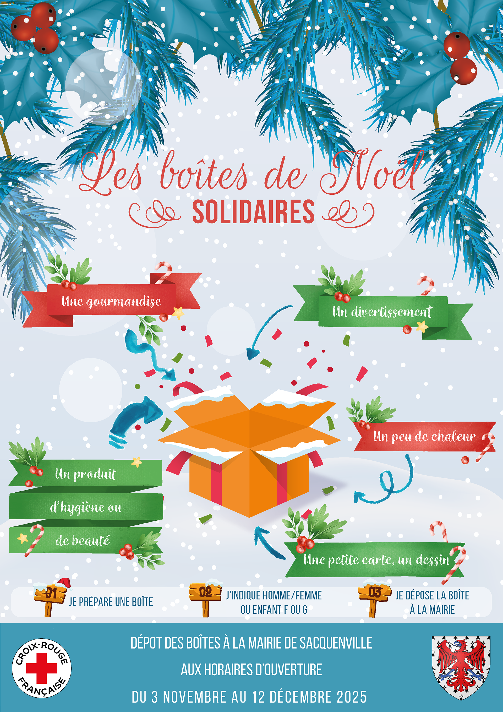 Affiche A3 réalisée dans le cadre de la collecte de boîtes solidaires de Noël de Sacquenville dans l'Eure (2025)